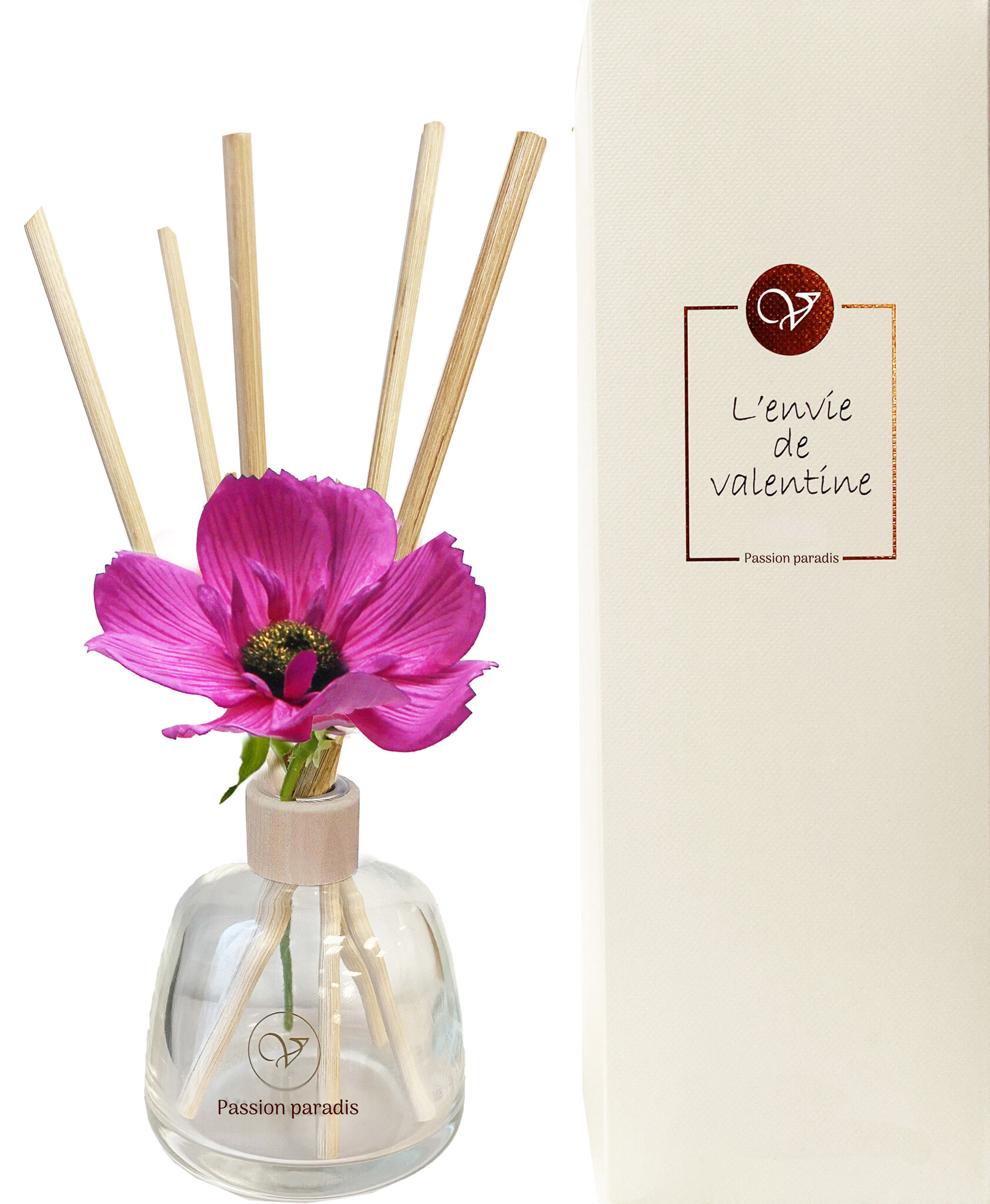Glazen flesje met geurolie, set stokjes en zijdebloem inbegrepen.
