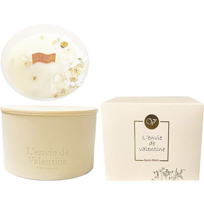 Geurkaars van sojawas in keramieken potje, versierd met droogbloemen. Houten dekseltje inbegrepen.