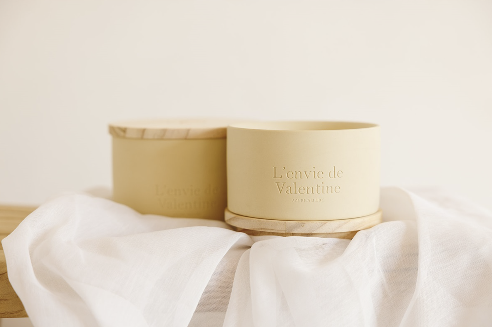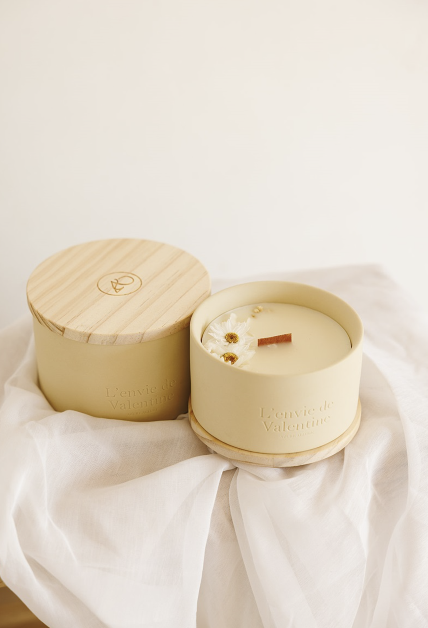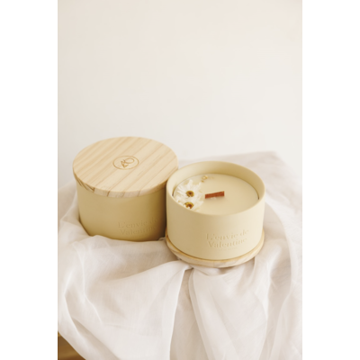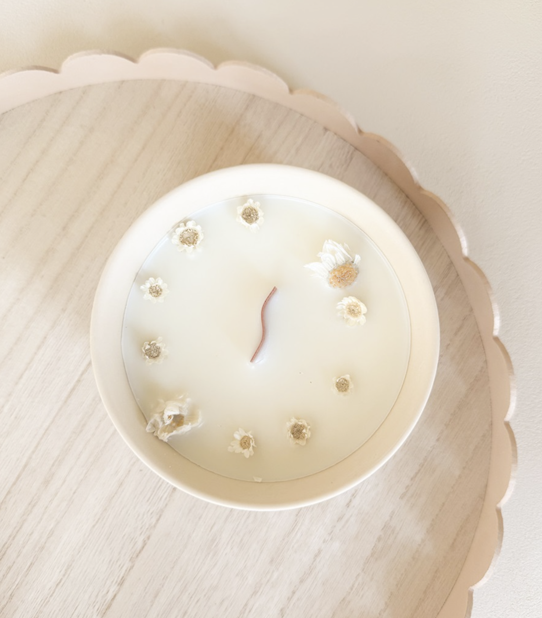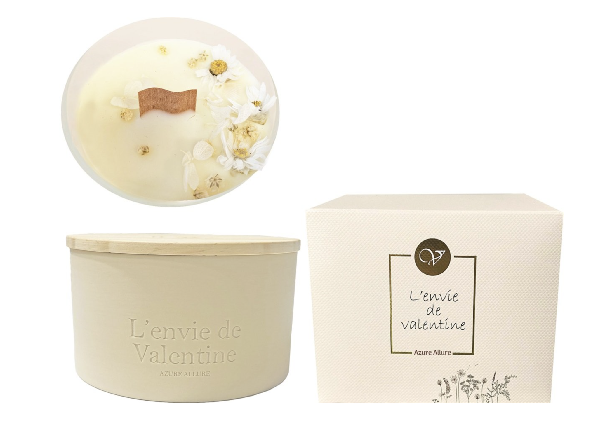 Geurkaars van sojawas in keramieken potje, versierd met droogbloemen. Houten dekseltje inbegrepen.