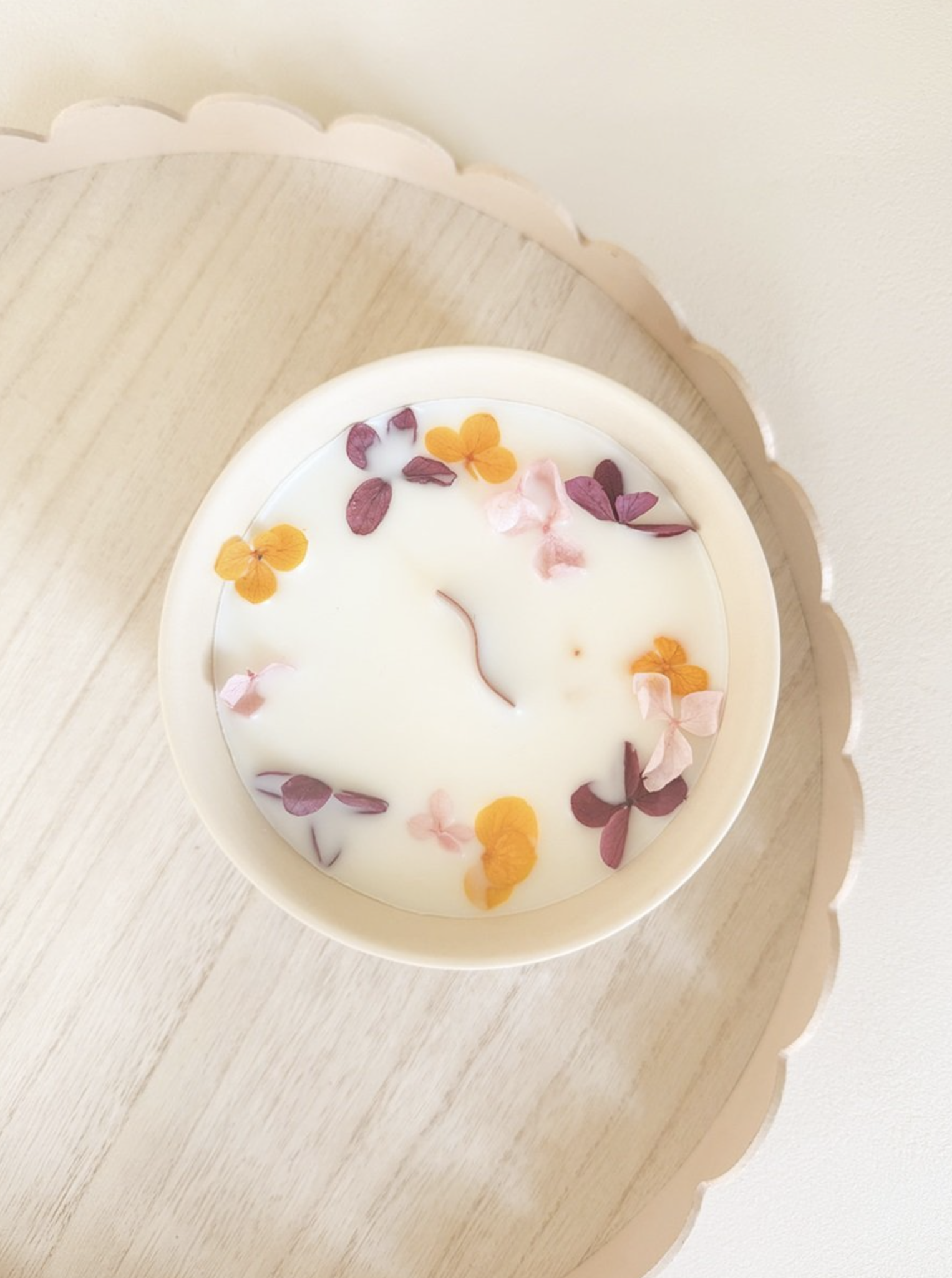 Geurkaars van sojawas in keramieken potje, versierd met droogbloemen. Houten dekseltje inbegrepen.