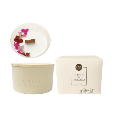 Geurkaars van sojawas in keramieken potje, versierd met droogbloemen. Houten dekseltje inbegrepen.