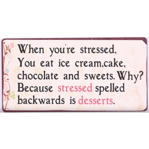 is toegevoegd aan uw winkelwagenMagneetje met tekst "When you're stressed you eat ice cream, cake, chocolate and sweets. Why? Because stressed spelled backwards is desserts"