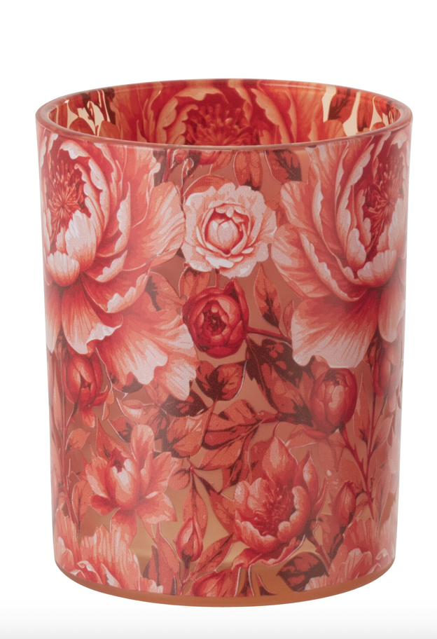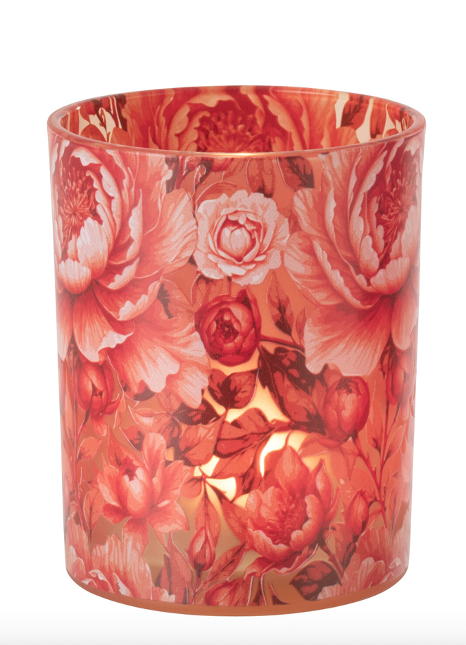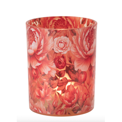 Mooie theelichthouder medium in oranje met bloemen.
